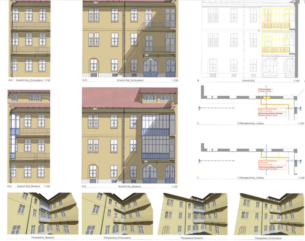 Die bestehenden Stabstahlgeländer werden in diesem Bereich ergänzt und gestalterisch an den Bestand angepasst. Die derzeit abweichende Farbgebung wird an die bestehende Fassadengestaltung angeglichen, um ein ruhiges und einheitliches Gesamtbild zu erzielen.